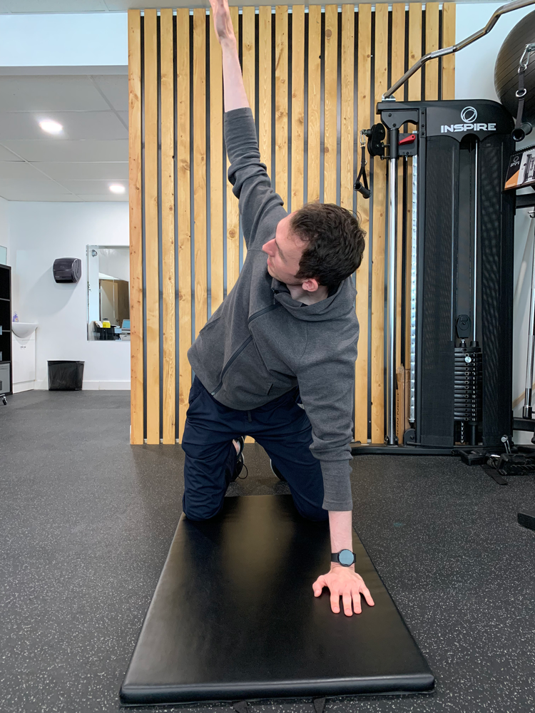 - Feeling stable with one hand on the floor, the trunk rotates to the opposite side, reaching hand towards the sky. You should feel a rotational stretch across the back and body.